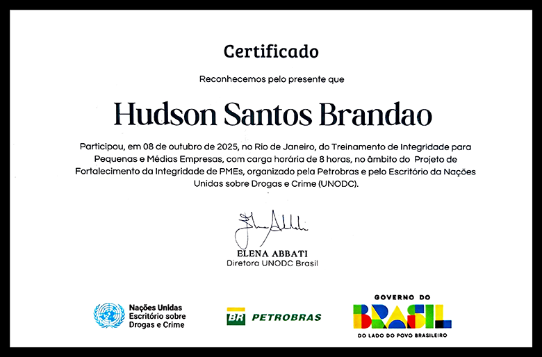 Programa de Fortalecimento da Integridade, O treinamento foi organizado em parceria entre a Petrobras e o Escritório das Nações Unidas sobre Drogas e Crime (UNODC), reforçando o compromisso com práticas de governança, transparência e ética corporativa. A participação nesse programa demonstra alinhamento com os padrões internacionais de integridade, contribuindo para o fortalecimento de ações responsáveis, seguras e baseadas em conformidade dentro do ambiente empresarial.